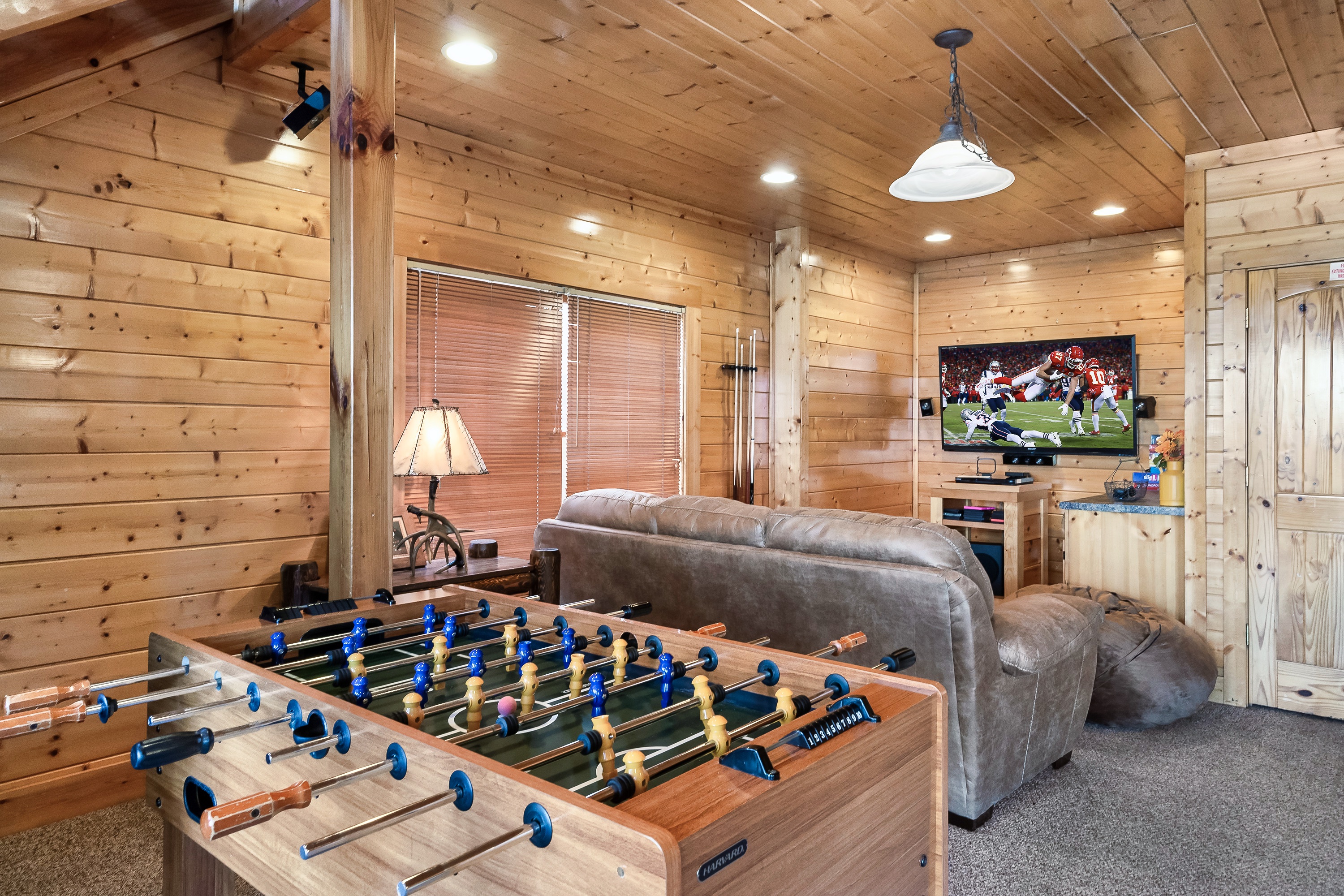 Enter the downstairs area of this vacation home and step into the ultimate game room! Challenge your friends and family to a game of billiards, foosball, or ping pong, or indulge in some old-fashioned board games. When you're ready to wind down, the shared sleeping area can accommodate up to six guests, with a queen bunk bed and queen sleeper sofa. , or Catch up on your favorite shows on the Roku TV. The downstairs also boasts a dedicated balcony with rocking chairs and stunning mountain views, perfect for relaxing after a fun-filled day.