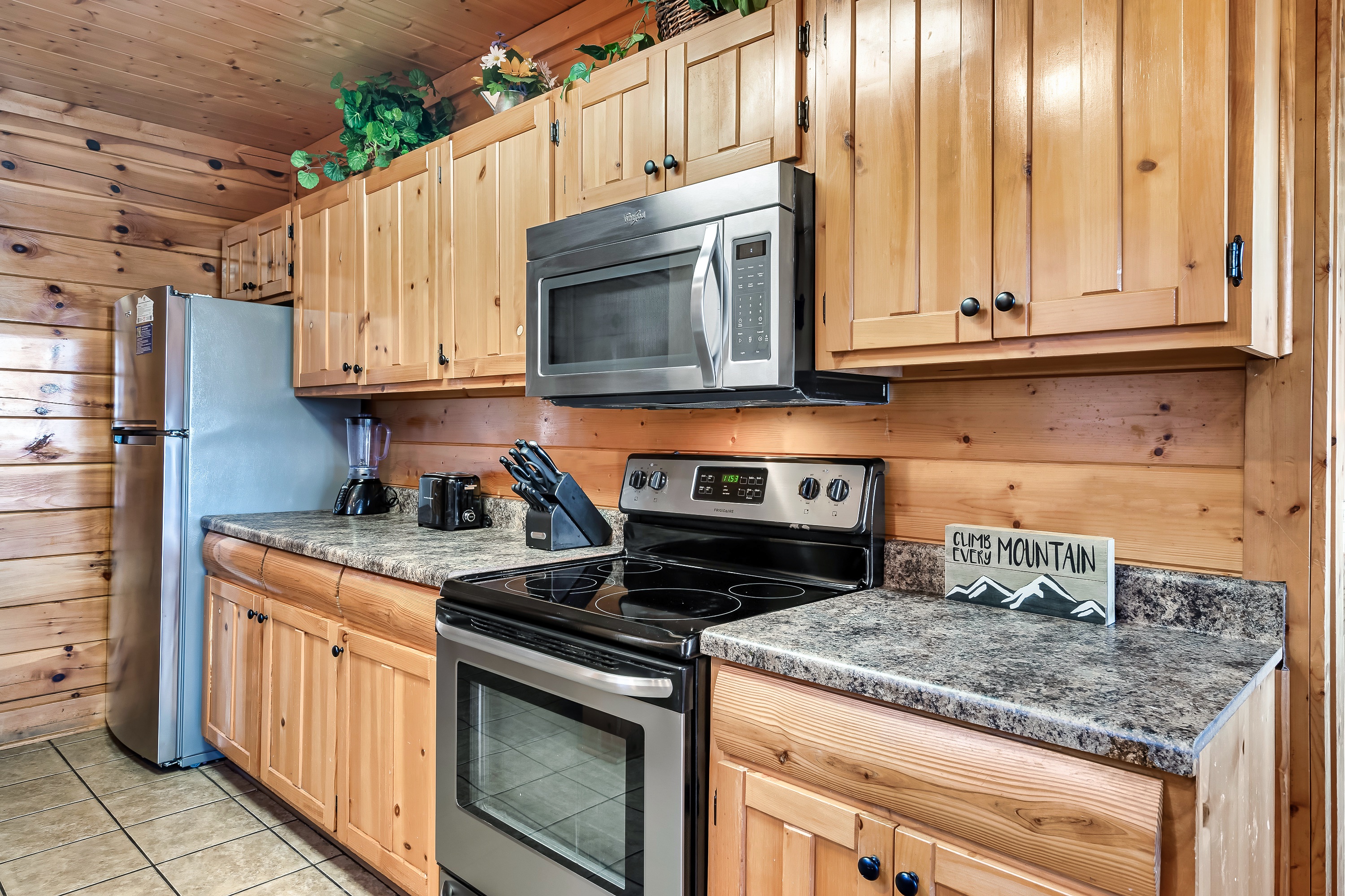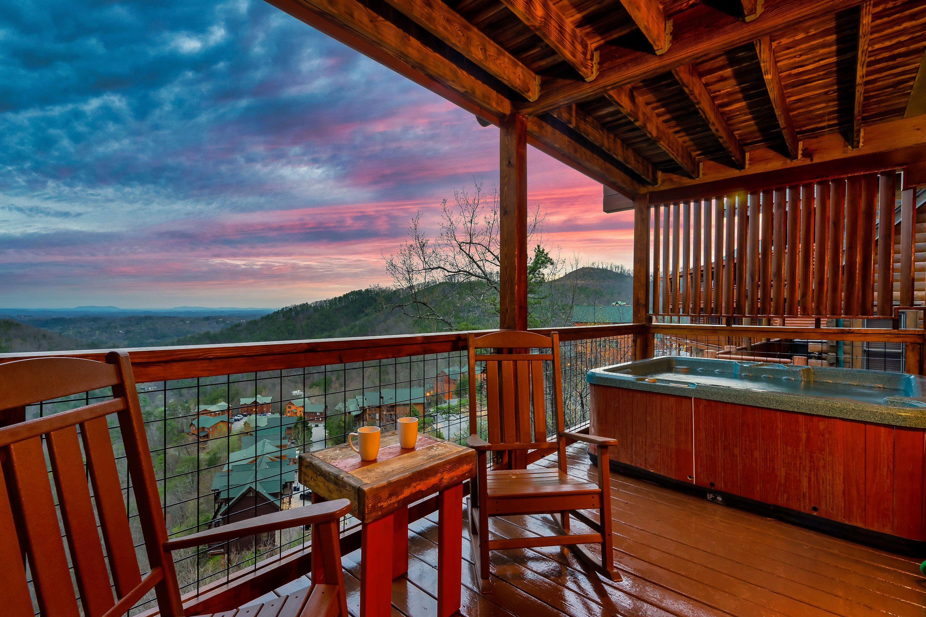 This Smoky Mountain's cabin is close to Pigeon Forge attractions (4 miles) with 3 story decks each with amazing views of Bluff Mountain! Game room has Arcade machine, Pool table, Foosball, and surround sound TV. A MASSIVE room upstairs with sky-scraping windows that has a King bed and the best views of the cabin!